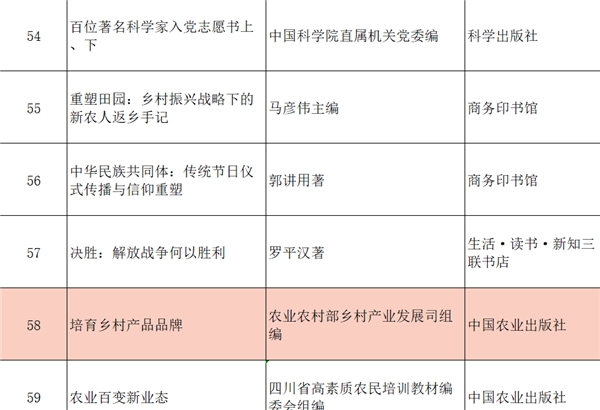 由农业农村部乡村产业发展司牵头组编的、我国农业品牌建设的官方指导书籍《培育乡村产品品牌》入选推荐目录,为各地农业农村部门、涉农企业巩固拓展脱贫攻坚成果、助力乡村振兴战略实施提供有力的智力支持。