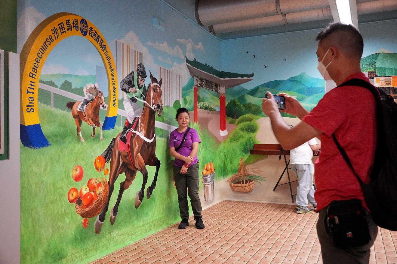 本地年轻艺术家杜海铨及其团队,以“赛马‧香港”为主题,在沙田马场展出五幅手绘巨型壁画,吸引了大批入场观众参观和拍照留念。