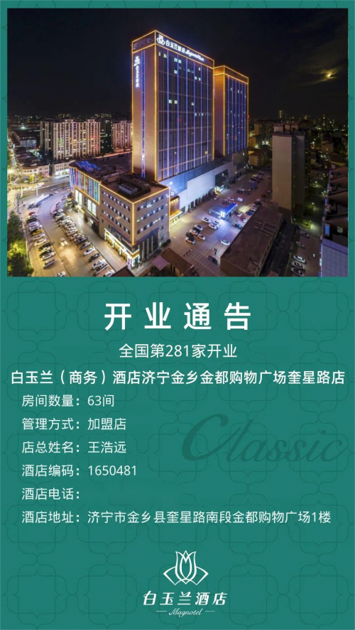 锦江酒店(中国区)旗下优选服务酒店品牌“白玉兰酒店”再添一员——白玉兰(商务)酒店济宁金乡金都购物广场奎星路店正式上线。