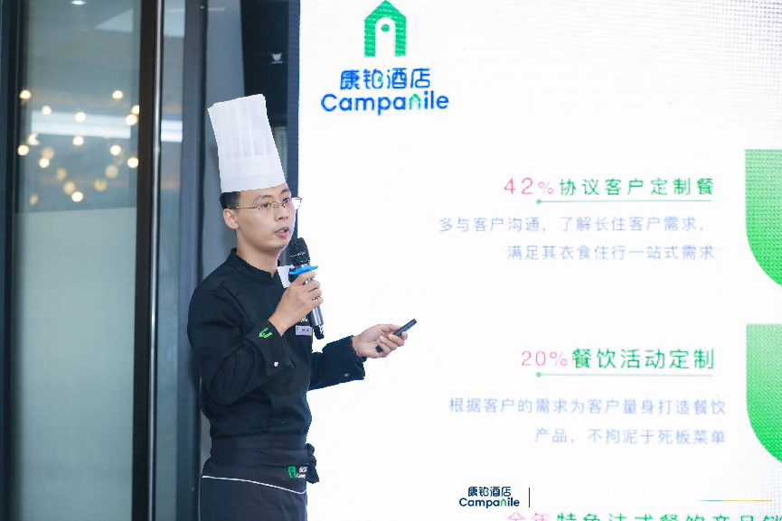 康铂北京店餐饮总监刘海华则为投资人们带来了如何充分释放餐饮等非房收入增长潜力的实战案例。作为在去年带领团队创下餐饮年收入118万优异成绩的酒店运营专家,他系统性复盘了康铂酒店在拓展餐饮营收方面的优势。刘海华表示,酒店投资者可在协议客户定制餐、餐饮活动定制、节假日活动增收、周边散客开发、特色法式餐饮产品销售等方面发力,持续拓展非房收入,提升整体营收水平。