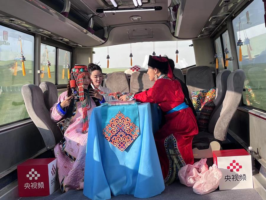 除了游览打卡,直播中还穿插了互动答题环节,每个问题都与景点特色和当地文化相关。看风景、学知识、答题赢取包括景区门票在内的特色奖品,让节目趣味十足。值得一提的是,直播节目对于当地文化资源的挖掘和呈现是十分扎实的,节目组特邀乌拉盖当地的手工艺人做客大巴车直播间,为大家展示草原上的“指尖艺术”——蒙古族刺绣,不同于人们熟知的苏绣,蜀绣等,蒙古族刺绣选材丰富,既可以在软面料上绣花,也可以用驼绒线、牛筋等在羊毛毡、皮靴等硬面料上进行刺绣。目前,蒙古族刺绣已被列为国家级非物质文化遗产代表性项目。