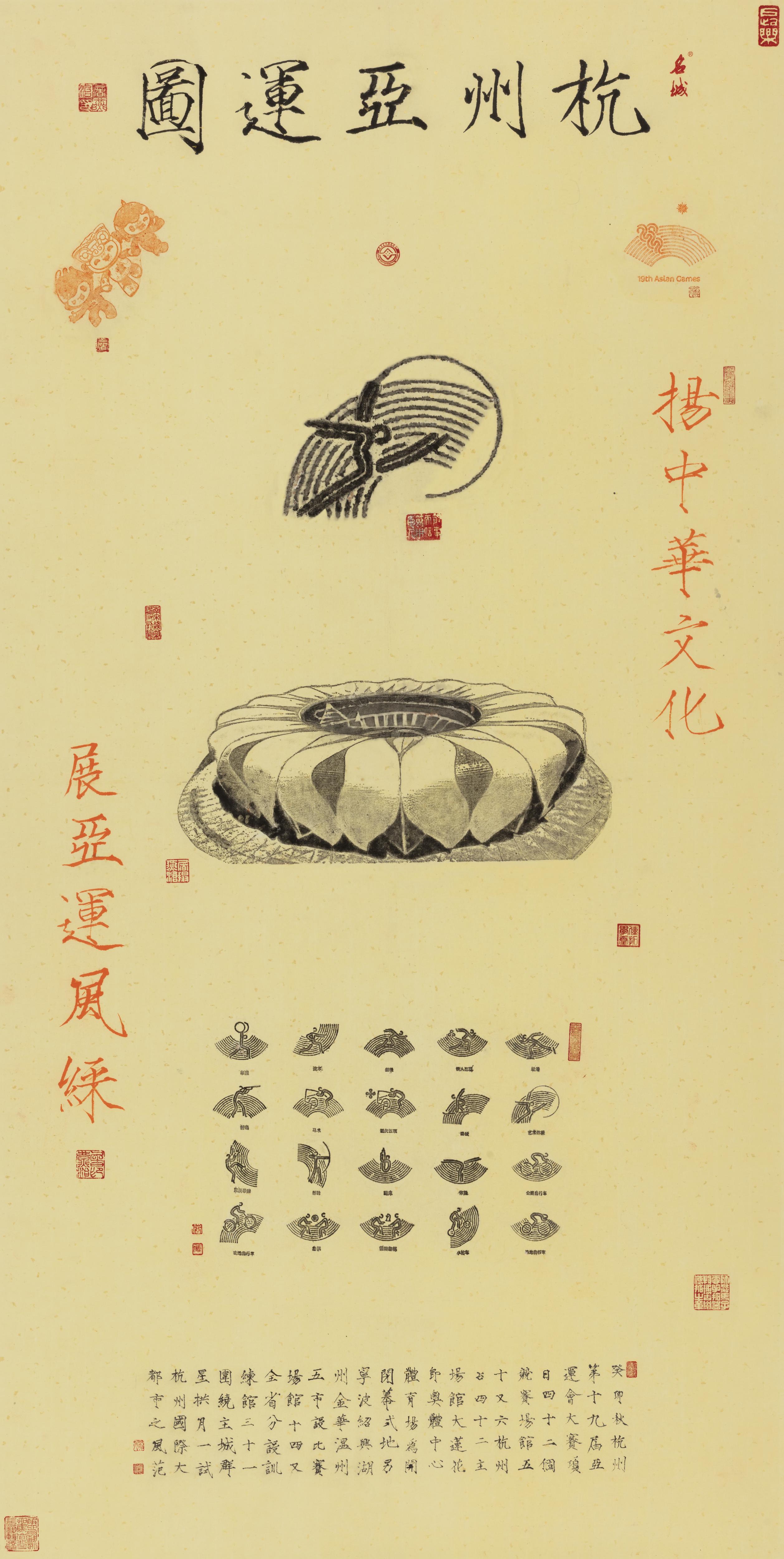 全形拓技艺传承人屠燕治则带来了《杭州亚运图》卷轴,卷轴高200厘米,宽80厘米,通过精湛的全形拓技艺,将杭州亚运会主场馆“莲花碗”形象拓印正中,立体生动,气势壮观。