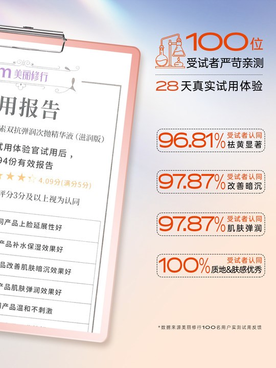虽然在开始测试前已经拥有9份⌈第三方权威功效检验报告⌋,为了验证产品更真实的功效,NACO虾青素再度打破行业功效检测天花板,联合百万严苛成分党聚集的平台——美丽修行。招募100位高度成分党体验官,进行为期28天的真人祛黄功效测试,结果证明,虾青素双抗次抛精华让受试者,皮肤祛黄、提亮、紧致度均有明显改善,祛黄⌈显著有效⌋名符其实!