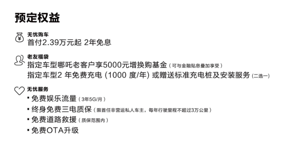 更让用户惊喜的是,除了低首付、2年免息的实惠外,2024款哪吒S还将诚意拉满:用户不但可以享受到8,000元金融贴息或者增换购补贴,哪吒老客户还可专享5,000元增换购基金,以及2年免费充电(1,000度/年)或赠送标准充电桩及安装服务;此外,3年5G/月的免费娱乐流量、终身免费的三电质保、免费道路救援和免费OTA升级将进一步为用户的无忧出行提供服务支持。