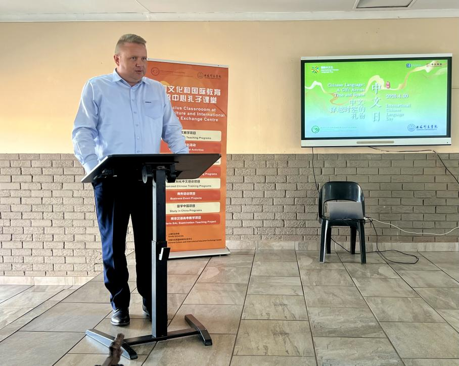 活动伊始,卡特洪工程专科学校校长欧普曼先生致辞欢迎。他深情回顾了2024年参与“汉语桥”南非校长访华团的经历,分享了对中华文化的赞叹和对中文教育的高度肯定。他表示,中文不仅是一种沟通工具,更是一把开启未来之门的钥匙,将为南非学子铺就通向世界的桥梁。
