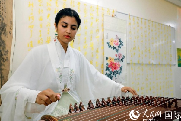 哈桑二世大学孔子学院的学生在表演古筝。人民网 舒艾卜摄