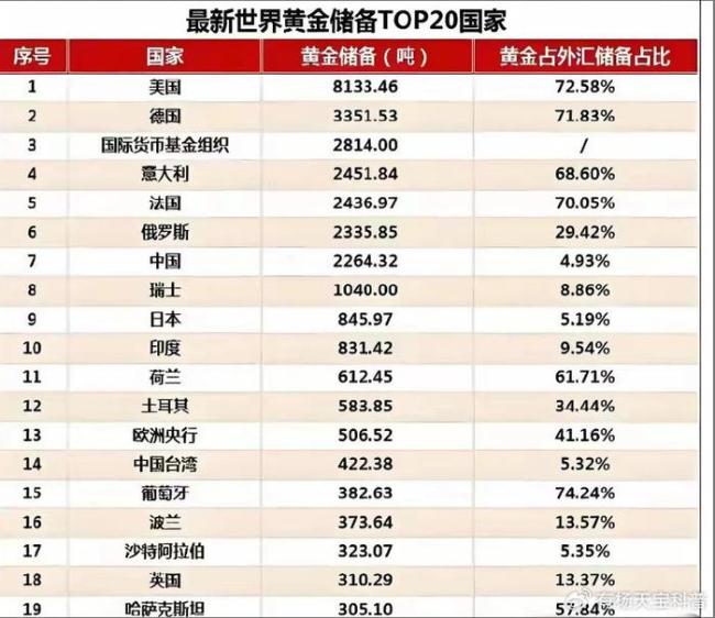 最新世界黄金储备TOP10第一,美国,8133吨;第二,德国,3352吨;第三,国际货币基金组织,2814吨;第四,意大利,2452吨;第五,法国,2437吨;第六,俄罗斯,2336吨;第七,中国,2292吨;第八,瑞士,1040吨;第九,日本,846吨;第十,印度,831吨。中国最近加快持有黄金的步伐,正全力扫货黄金,加大黄金储备力度。