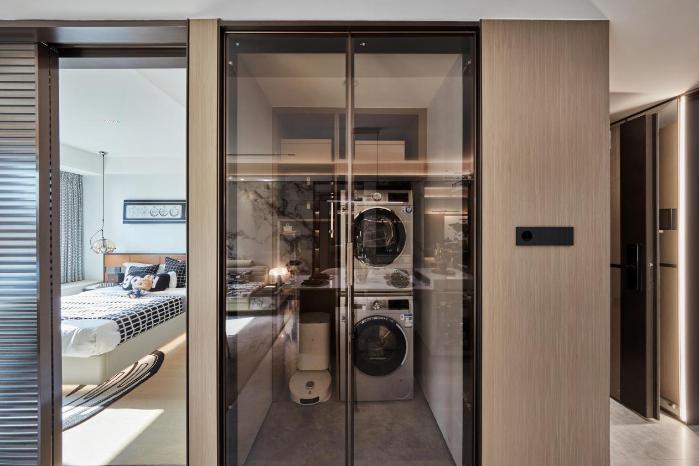 京华国贤府在收纳功能打造上独具匠心,融入诸多精妙设计。如入户玄关处,打造通顶玄关柜,中间设置凹龛平台,方便放置车钥匙、墨镜、雨伞等小物件,归家出门皆能有条不紊。下方是应季鞋子收纳区,高度可容纳长靴,并贴心安装除臭装置。入户门处设置独立家政空间,洗烘套装、换洗衣物、清洁用品都有处可去,餐厅旁设置一组餐边柜,红酒、咖啡、精美餐具都可在此处展示,装点生活。