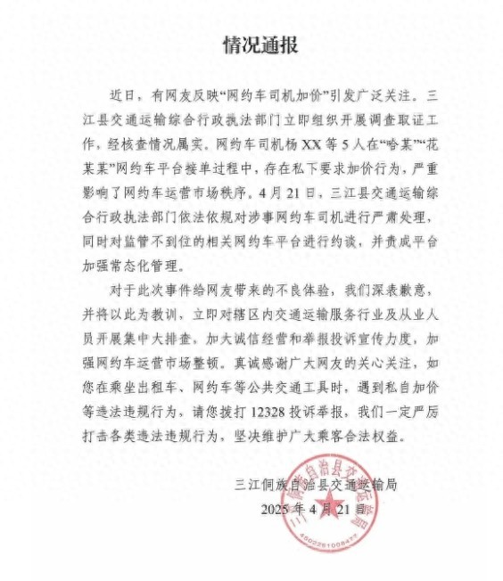 4月21日,三江县交通运输综合行政执法部门对这些违规的网约车司机进行了严肃处理,并约谈了监管不力的相关网约车平台,要求平台加强日常管理。