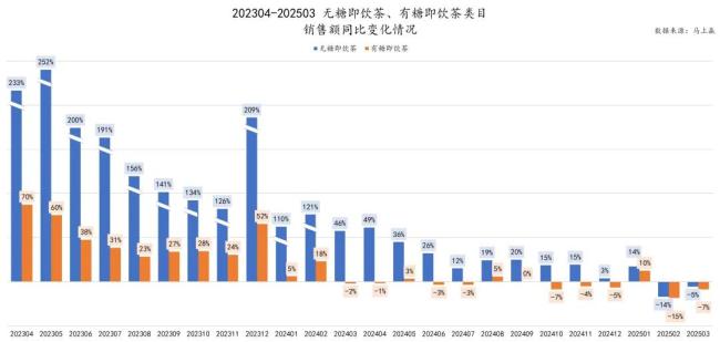 但是从各月度的无糖茶销售额增长情况来看,形势也与2023年有明显不同。2023年,无糖茶增速处于高速扩张阶段,多个单月同比增速超过100%,最高超过250%;进入2024年后,增速虽有所放缓,但大多数月份仍维持在10%以上。但在2025年2月和3月,无糖茶的增速竟出现负值。而2024年的2月和3月,无糖茶增速分别高达121%、46%。