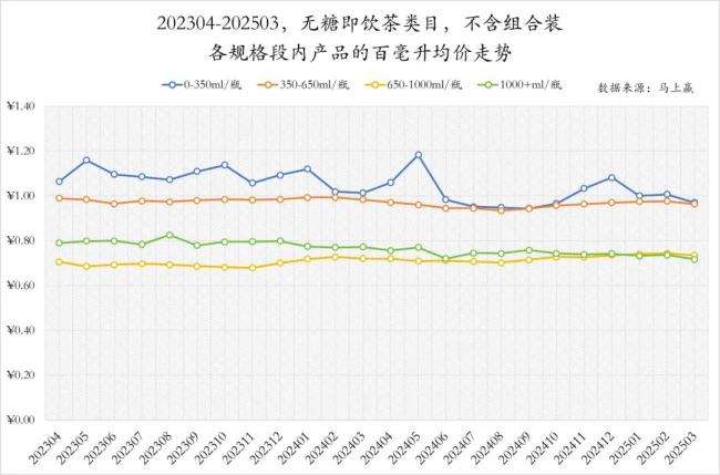 价格趋势进一步印证了这一变化。从价格表现来看,一个有趣而重要的现象是:在2023年上半年,650–1000ml段产品的百毫升均价反而低于1000ml以上产品,是当时“最便宜的容量段”。然而随着市场调整,这一趋势发生逆转——1000ml以上产品的百毫升价格自2024年初开始持续下降,并逐步与650–1000ml段拉平,两个大容量段的性价比正在趋同。