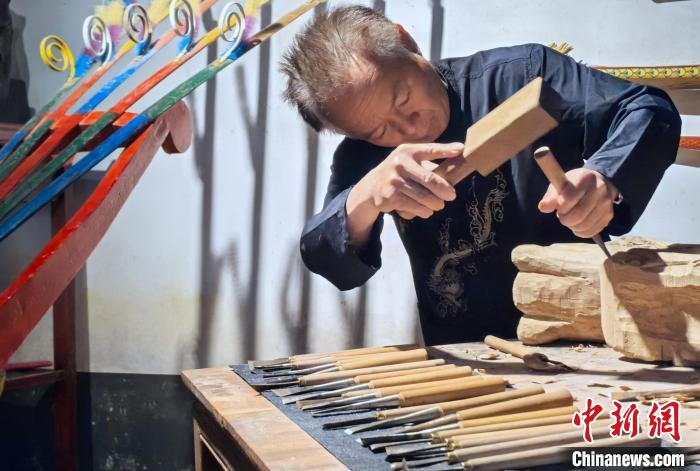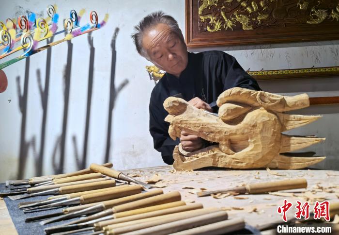 4月24日,湖南汨罗龙舟手艺匠人、许氏龙舟制造技艺传承人许桂生正在制作龙头。中新社记者 刘双双 摄