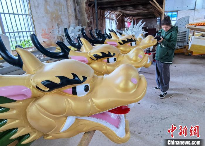 4月24日,外国摄影师在湖南汨罗市屈子祠镇一龙舟制造厂拍摄。端午节前,聚集10余家龙舟厂的屈子祠镇迎来造船旺季。中新社记者 刘双双 摄