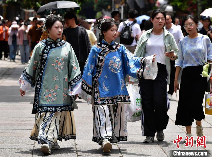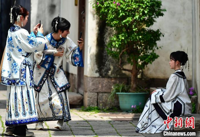图为5月5日,头戴“三条簪”身着汉服的游客在福州三坊七巷打卡留影。中新社记者 张斌 摄