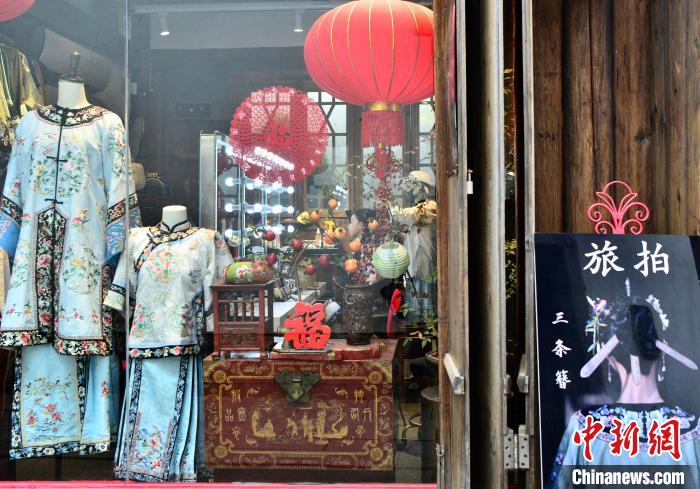 图为5月4日,跟拍摄影师在福州三坊七巷为游客拍摄“三条簪”妆造。中新社记者 张斌 摄