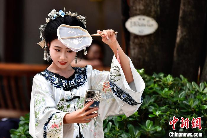 图为5月5日,头戴“三条簪”身着汉服的游客在福州三坊七巷自拍留影。中新社记者 张斌 摄