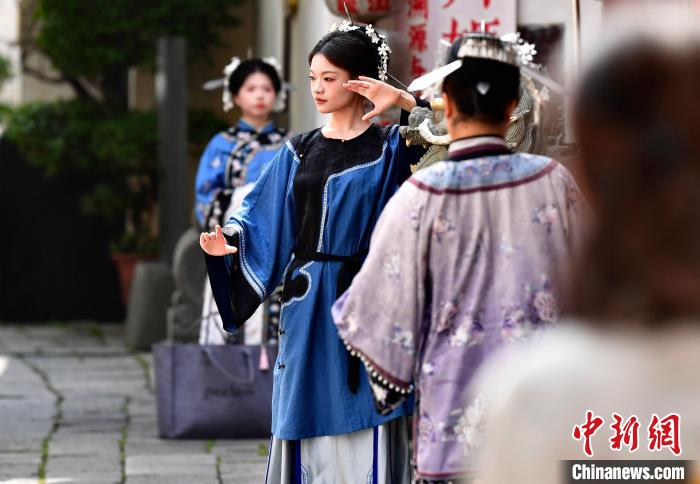 图为5月5日,在福州三坊七巷头戴“三条簪”身着汉服的游客在跟拍摄影师的指导下留影。中新社记者 张斌 摄