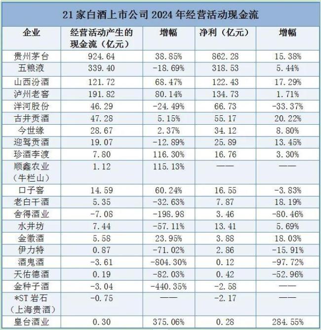 截至2024年年底,21家白酒上市公司共取得1747.65亿元经营现金流,与2023年基本持平,其中10家公司取得了正向增长。行业TOP5中,贵州茅台、山西汾酒、泸州老窖延续领跑势头,2024年经营现金流分别上涨38.85%、68.47%、80.14%。