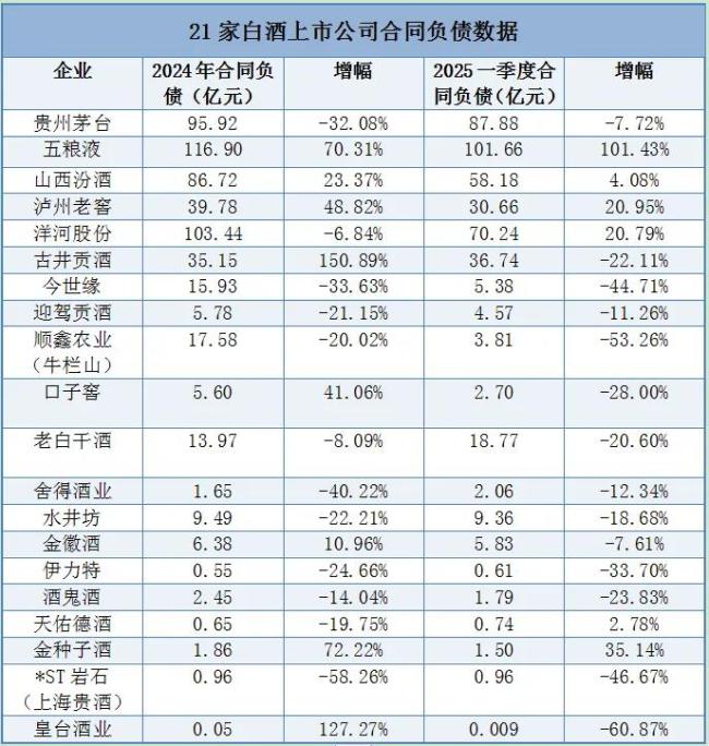 截至2024年年底,A股20家白酒公司共有560.81亿元合同负债,与去年基本持平;2025年一季度实现443亿元合同负债,环比2024年数据有所下降,行业认为主要受酒企主动降速、春节旺季回款发货节奏所致。