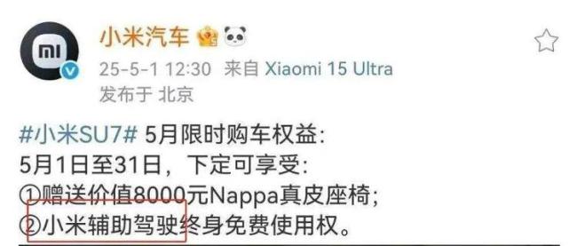 5月1日,小米官方微博发布了一组宣传物料,海报中以往“小米智驾”的话术换成了“小米辅助驾驶”。对比官网发现,更换话术的有两款配置:“小米智驾 Pro”更名为“小米辅助驾驶 Pro”,而SU7 Pro/Max车型的“小米智驾 Max”则更名为“小米端到端辅助驾驶”。