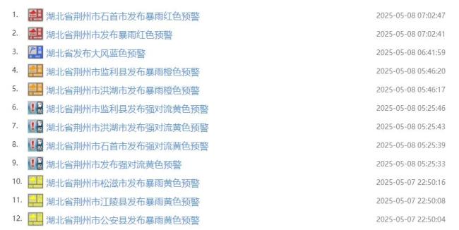 昨夜今晨,荆州地区连续发布暴雨预警信号,从黄色升级到橙色,最终于5月8日7时2分,荆州市气象台和石首市气象台将预警信号升级为红色。截至5月8日08时的24小时内,荆州市出现了大范围的大到暴雨天气,其中石首、监利、洪湖等地降水尤为明显。