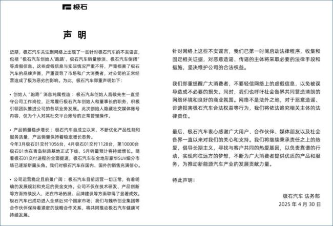 2025年4月中旬,昌敬突然清空微博、抖音等社交媒体账号的举动,迅速引爆舆论场。直至4月30日,极石汽车法务部才对“创始人跑路”“企业倒闭”等传闻作出回应,强调这只是创始人的个人账号管理行为。