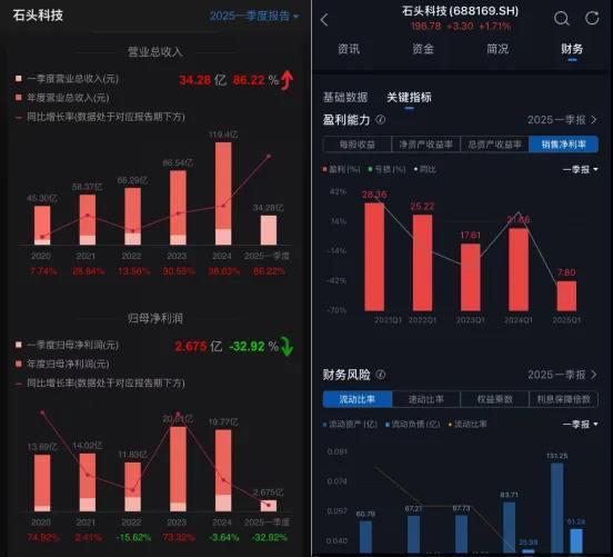 2025年第一季度,石头科技的业绩表现呈现出强烈的矛盾与割裂:一方面,营收实现34.28亿元,同比激增86.22%,展现出强劲的市场拓展势头;另一方面,归母净利润却仅为2.675亿元,同比大幅下滑32.92%,形成鲜明反差。销售净利率更是从去年同期的21.66%断崖式下降至7.8%,折射出盈利质量的显著恶化。更令人担忧的是,衡量企业“造血能力”的经营活动现金流量净额录得-4218.67万元,同比降幅高达118.09%,暴露出公司在现金流管理与盈利可持续性方面面临的严峻挑战。这种规模增长与利润收缩并存的“冰火两重天”局面,无疑给企业的未来发展蒙上一层阴影。
