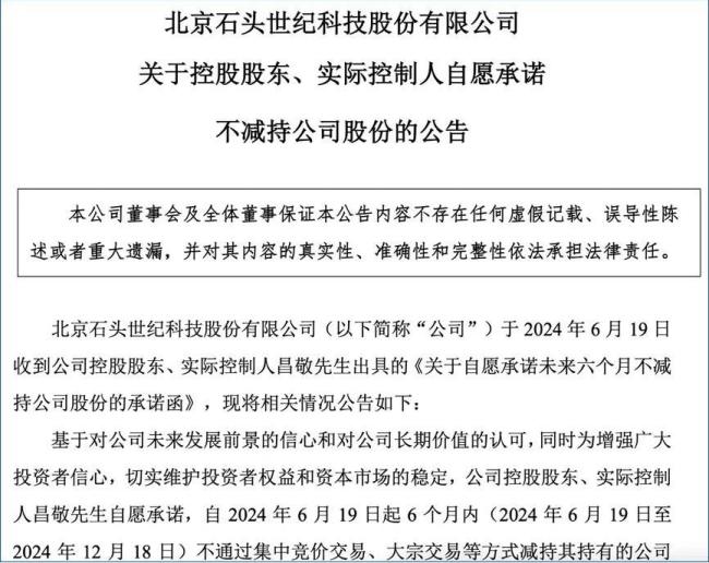 尽管石头科技与极石汽车同属昌敬商业版图的重要布局,但作为上市公司,石头科技承载着众多投资者的利益诉求与监管层的规范要求,容不得半点疏忽。在昌敬完成第二次套现后,市场质疑声浪四起。为稳定投资者信心,石头科技迅速发布《控股股东、实际控制人自愿承诺不减持公司股份》公告,明确限制昌敬自2024年6月19日起6个月内,不得以集中竞价、大宗交易等任何方式减持公司股份,试图通过制度性承诺缓解市场对创始人“重造车、轻主业”的担忧。