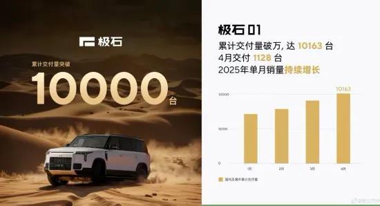 那么,极石汽车的销售情况如何呢?据资料显示,极石汽车首款车型极石01于2023年8月22日上市,价格区间在29.99万元至35.99万元之间。该车由北汽代工生产,定位户外豪华SUV,搭载双电机四驱增程电动系统,综合续航里程超1115公里。日前,极石汽车宣布极石01总销量突破1万台,今年4月交付了1128台,并强调“2025年单月销量持续增长”。