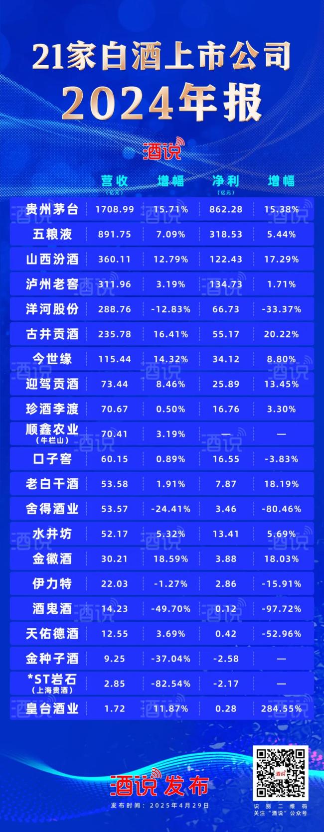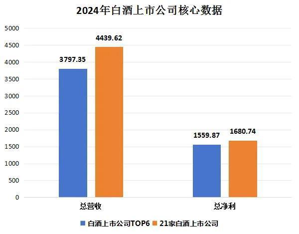 从2024年财报数据看,21家白酒上市公司总营收4439.62亿元,净利润总额1680.74亿元(注:因顺鑫农业未单独披露牛栏山净利润,净利润总额为20家白酒企业数据)。