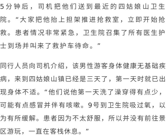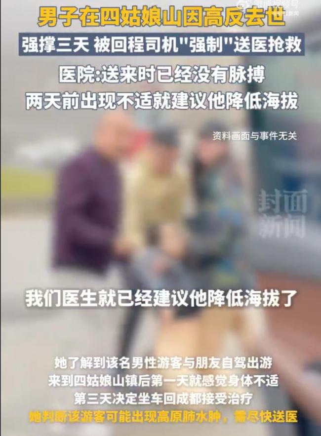 网传信息显示,这名男性游客与三名朋友自驾出游,在到达四姑娘山镇的第一天就感到身体不适。同行人员随即打了一辆顺风车,准备把他送往成都接受治疗。顺风车司机接到订单后,于次日早上接到了该名男性游客及其一位同伴,并将他们送到了卫生院进行抢救。