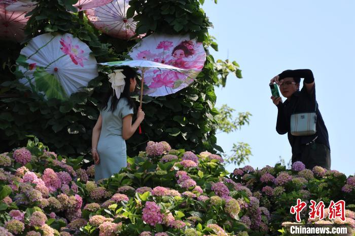 5月12日,贵州惠水,游客在绣球花海中拍照。刘美伶 摄