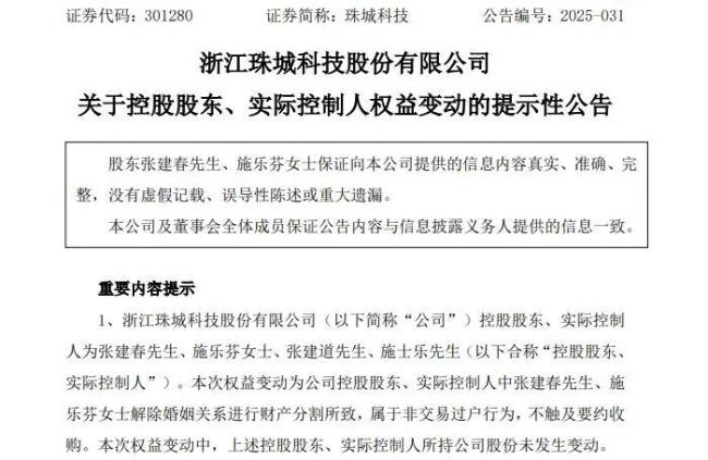5月7日晚间,珠城科技(301280.SZ)发布公告显示,公司控股股东、实际控制人中张建春、施乐芬解除婚姻关系,张建春拟将其直接持有的876.75万股股票分割过户给施乐芬。