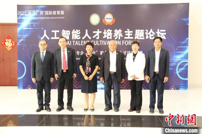 当地时间5月14日,2025“留学广西”教育展(柬埔寨站)人工智能人才培养主题论坛在金边举办,广西壮族自治区教育厅副厅长张旭凤(左三)、柬华理事总会轮值会长林少雄(右三)等出席。李翼 摄