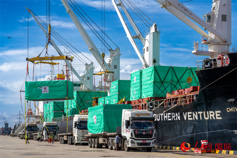 5月14日,当地工人在援缅第十四批紧急人道主义地震救灾物资交付现场作业。人民网记者 谢佳君摄