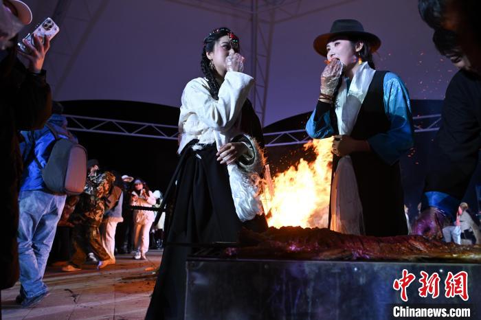 图为游客身着藏族节日盛装在“情定当雄”篝火锅庄晚会吃烤全羊。中新社记者 贡嘎来松 摄