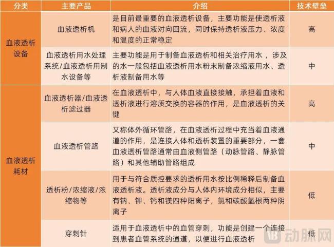 以血液透析为例,相关医疗器械可分为血液透析设备和血液透析耗材。血液透析设备包含血液透析机、血液透析用水处理设备等;血液透析耗材包含血液透析器、血液透析管路、透析粉/液、穿刺针等。每一类产品均有其独特的壁垒。