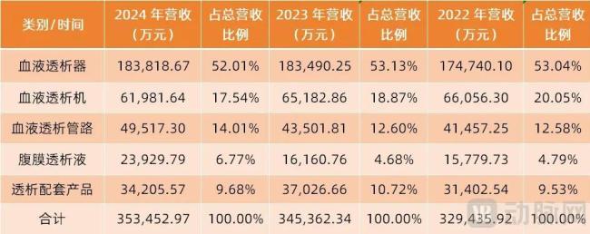 与上述企业不同,威高血净的核心业务是血液透析器。2022-2024年,威高血净的血液透析器分别营收17.5亿元、18.34亿元、18.38亿元,分别占总营收的53.04%、53.13%、52.01%。而血液透析器具有较高的技术壁垒,其毛利率超过60%。