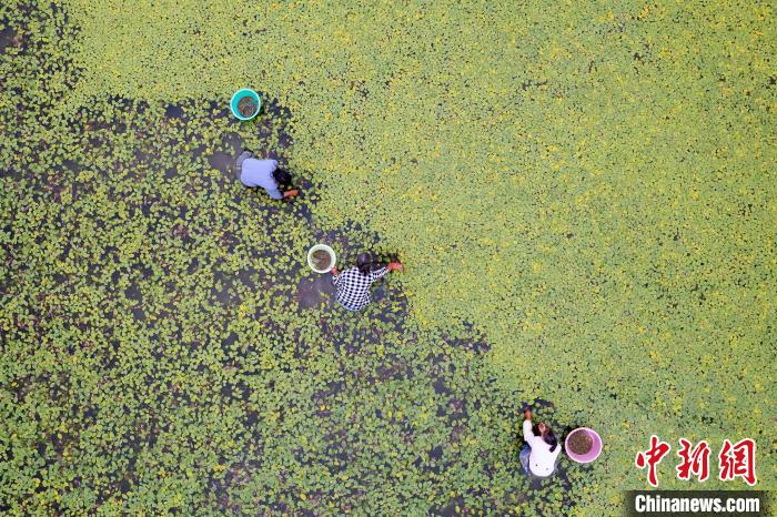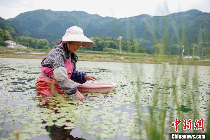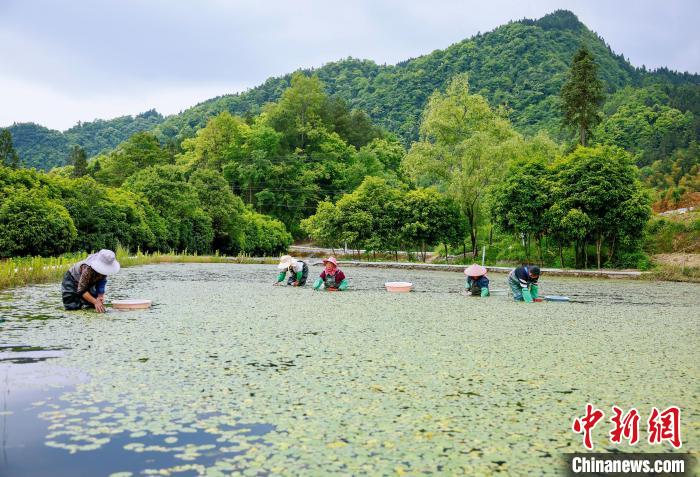近日,在湖北省恩施土家族苗族自治州咸丰县黄金洞乡五谷坪村的高山莼菜基地,身穿防水裤的村民们忙着采摘莼菜。莼菜被誉为“水中人参”,天生娇贵,对水质、土壤等生态环境要求非常高。近年来,咸丰县利用独特的生态环境,因地制宜发展莼菜、白茶等特色产业110万亩,助农增收致富,助力乡村振兴。杜迪纳 摄