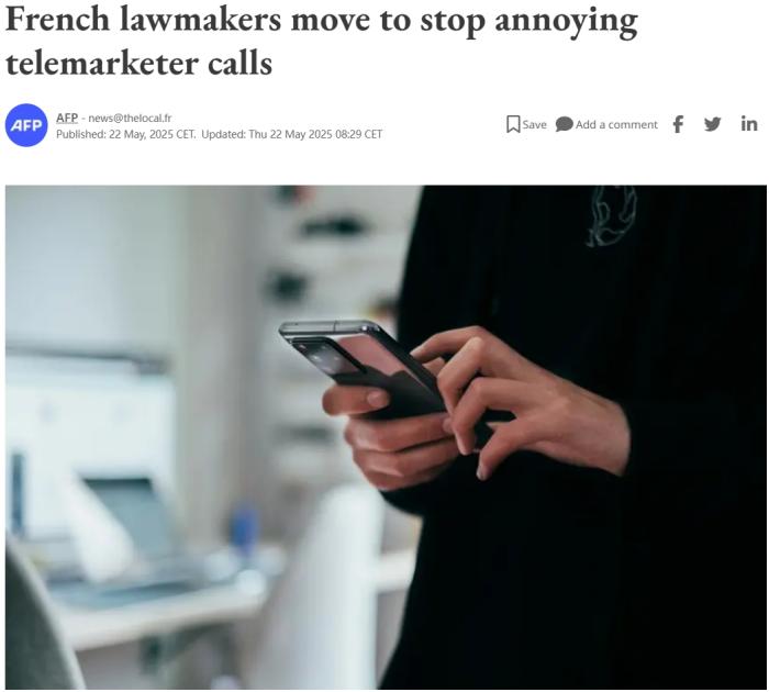 中新网5月23日电 据法新社报道,法国议会于当地时间21日采取行动,禁止电话推销员拨打令人厌烦的、未经请求的电话,法律预计将于2026年8月生效。