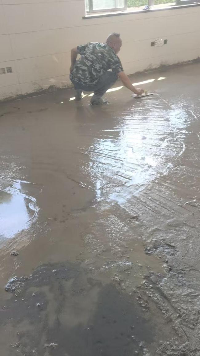 齐建军面朝刚泼洒在地上的泥浆蹲下,左手撑住膝盖,身体前倾,微微踮脚,右手伸向最远端,用抹子把四散的泥浆由远及近来回刮平,再用腰部的力量将上身收回,挪腿往后撤步——这样的动作他一天要重复数百次。
