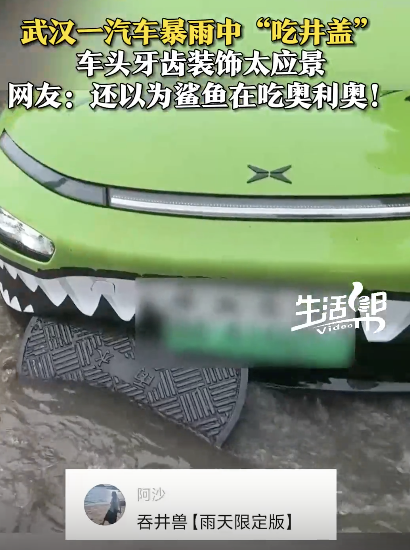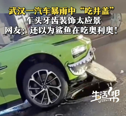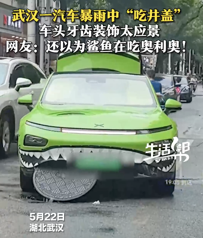 武汉暴雨街头有车吃井盖。5月22日,湖北武汉,一汽车在暴雨中被翘起的井盖卡到,因车头牙齿装饰太应景,被网友调侃“鲨鱼在吃奥利奥”而走红。车主:正在联系水务公司。