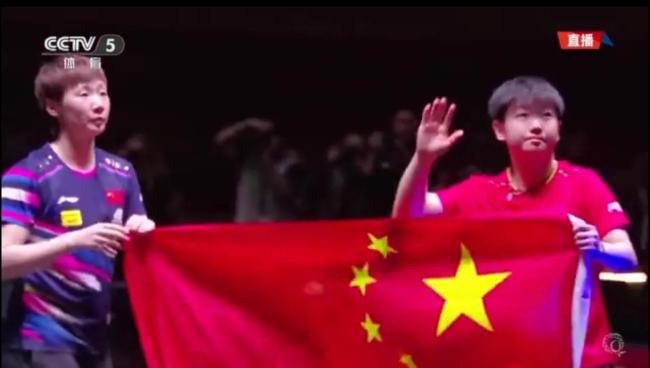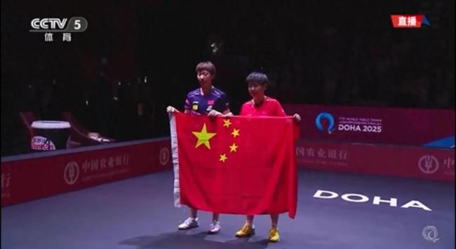 孙颖莎王曼昱举起国旗 共贺女单辉煌