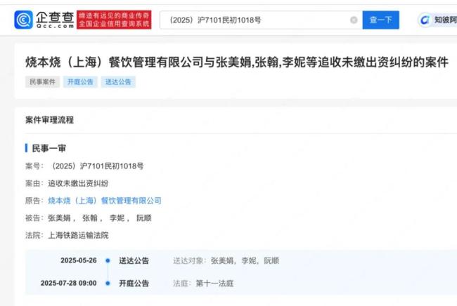 5月26日,上海铁路运输法院发出的一张传票,将演员张翰与烧本烧餐饮公司的资本纠纷推至公众视野。传票涉及烧本烧(上海)餐饮管理有限公司与张翰等人追收未缴出资纠纷一案,该案定于7月28日在上海铁路运输法院开庭审理。