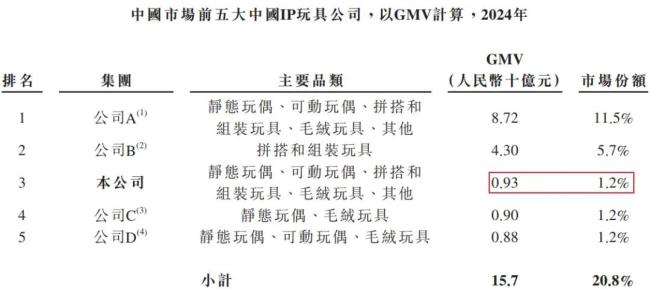按2024年中国市场GMV计算,52TOYS是中国第三大IP玩具公司,市场份额1.2%,仅次于泡泡玛特(11.5%)和布鲁可(5.7%)。