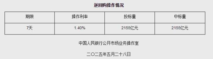 中新网5月28日电 据央行网站消息,2025年5月28日中国人民银行以固定利率、数量招标方式开展了2155亿元逆回购操作。具体情况如下: