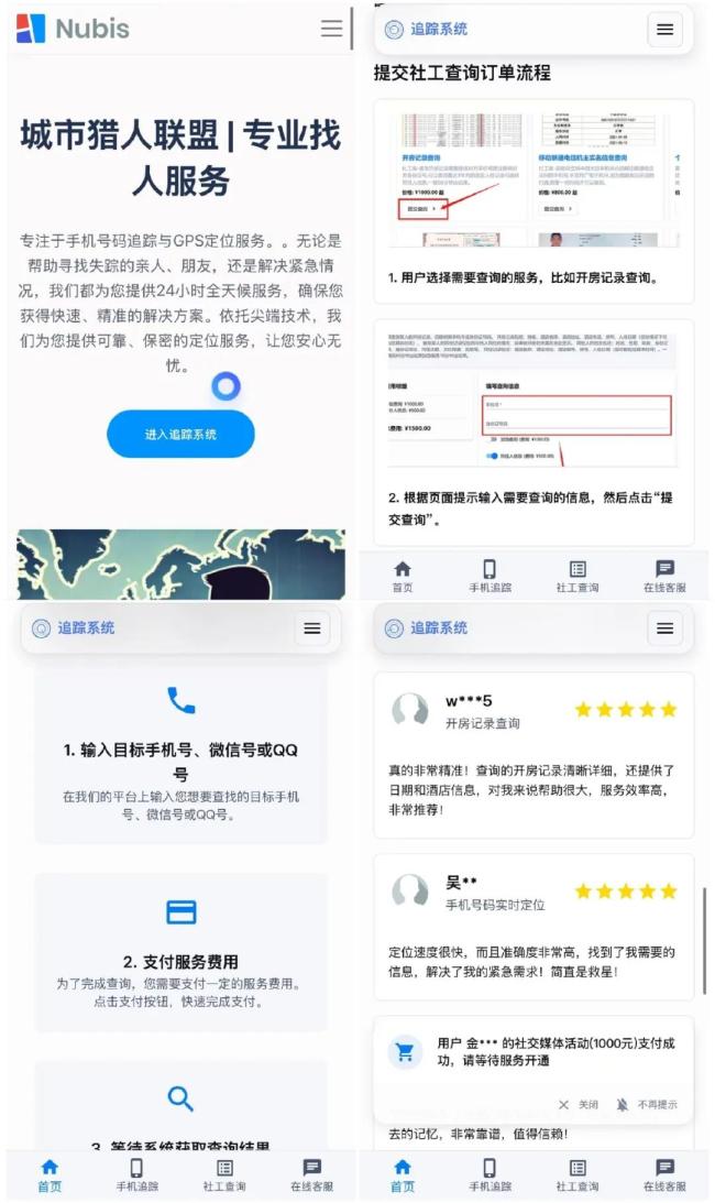 在百度搜索平台输入“开盒”“专业查人”等关键词时,名为“城市猎人联盟”的网站赫然出现。该网站页面设计简单,直接列出“业务清单”,明确宣称只要用户提供手机号码、身份证号等关键信息,付费后即可获取对应人员的实时定位、户籍档案、工作履历等详细个人资料。北京商报记者尝试与网站客服沟通,对方表示,交易全程匿名且承诺信息准确性,交易金额根据信息敏感程度从数百元到数千元不等。