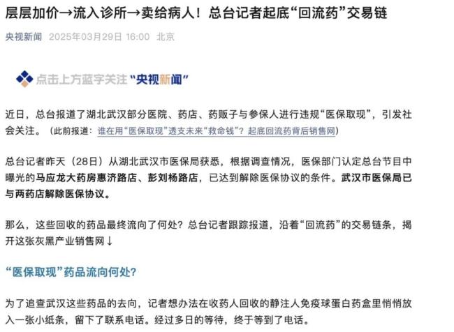 所谓“回流药”,就是那些通过非法途径,从正规医院、药店流出,又再次回到市场上的药品。今年3月,央视报道了湖北武汉部分医院、药店、药贩子与参保人进行违规“医保取现”,“回流药”的购销链条浮出水面。据报道,武汉的收药人招揽参保人到在马应龙大药房的两家门店购药“套现”,再将回收的静注人免疫球蛋白等药品,通过中间人何某转卖给新洲区的供货商罗某,罗某再转卖给新洲区的卫生院、私人诊所和药店,最后用到患者身上。