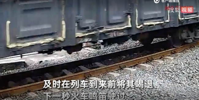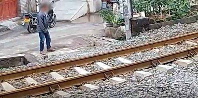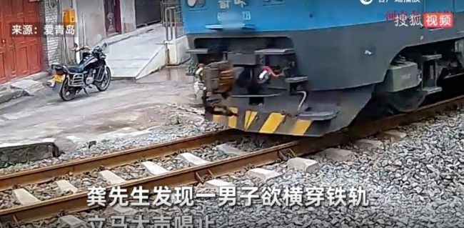 现场:居民喝退横穿铁轨男子火车瞬间驶过!