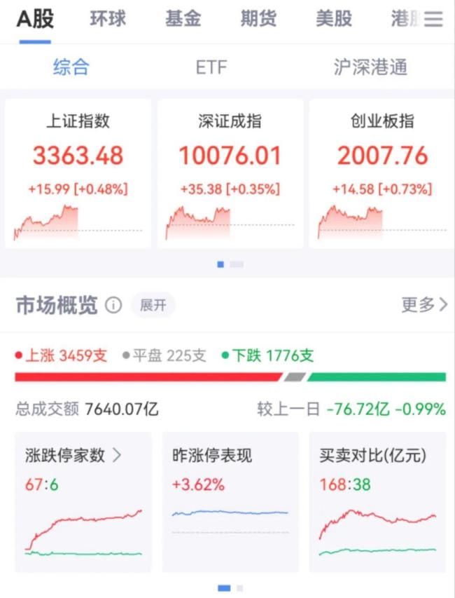 6月3日,市场低开高走迎来节后开门红,创业板指领涨。A股半天成交额为7640.07亿元,较上个交易日减少76.72亿元。盘面上,市场热点良性轮动,个股涨多跌少,全市场超过3400只个股上涨。截至午间收盘,沪指涨0.48%,深成指涨0.35%,创业板指涨0.73%。